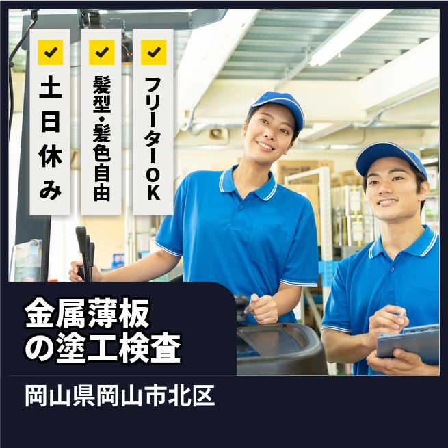 給与詳細 月収例 262,500円 日給例 12,000円 勤務地 岡山県岡山市北区 仕事内容 ロール状の金属薄板に液体を塗布したり、1m幅にカットし検査・梱包するお仕事です。