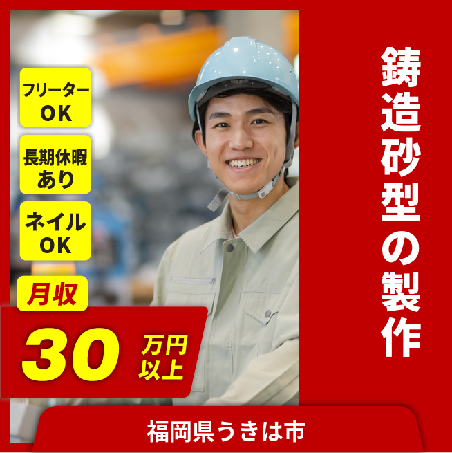 給与詳細 月収例 311,250円 日給例 12,000円 勤務地 福岡県うきは市 仕事内容 とけた金属を流す砂の型を作る作業。