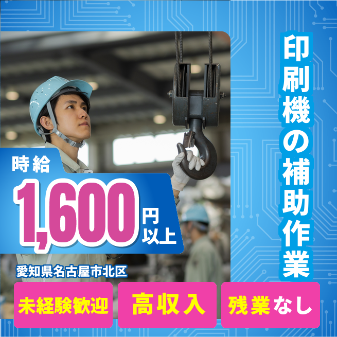 給与詳細 月収例 201,000円 時給例 1,600円 勤務地 愛知県名古屋市北区 仕事内容 印刷機械の詰まりや印刷の確認、版をかえる、紙やテープの補充、詰まりの除去や台車の移動、清掃作業があります。