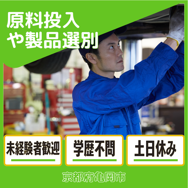 給与詳細 月収例 231,150円 日給例 10,000円 勤務地 京都府亀岡市 仕事内容 原材料を機械に投入オペレート作業になります。