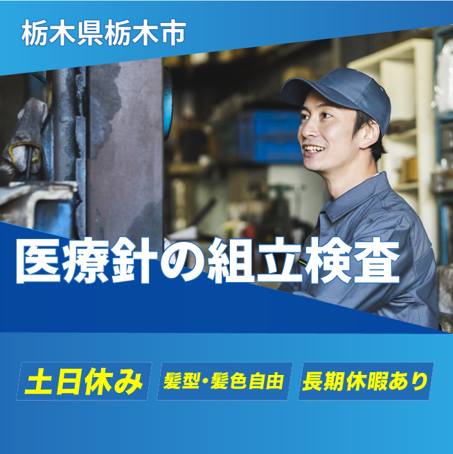 給与詳細 月収例 237,858円 日給例 10,250円 勤務地 栃木県栃木市 仕事内容 医療用特殊針に関わる製品の組立(マシンオペレーターおよび検査)医療品を製造するので、衛生面は特に注意が必要な作業になります。