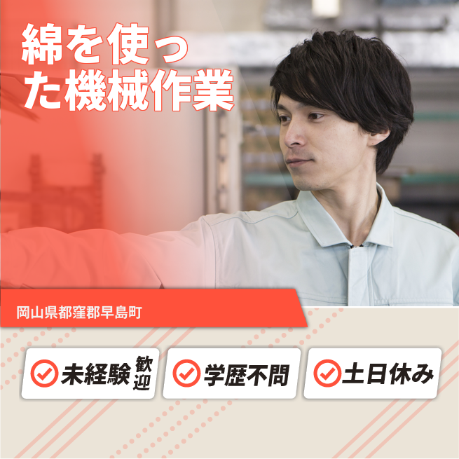 給与詳細 月収例 235,145円 日給例 10,750円 勤務地 岡山県都窪郡早島町 仕事内容 【業務内容】