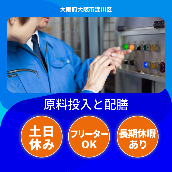 給与詳細 月収例 225,000円 日給例 11,250円 勤務地 大阪府大阪市淀川区 仕事内容 【原料投入工程】
