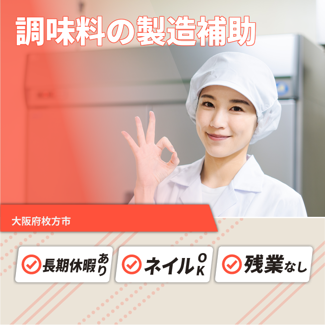 給与詳細 月収例 220,000円 日給例 11,000円 勤務地 大阪府枚方市 仕事内容 ポン酢の製造をお願い致します。