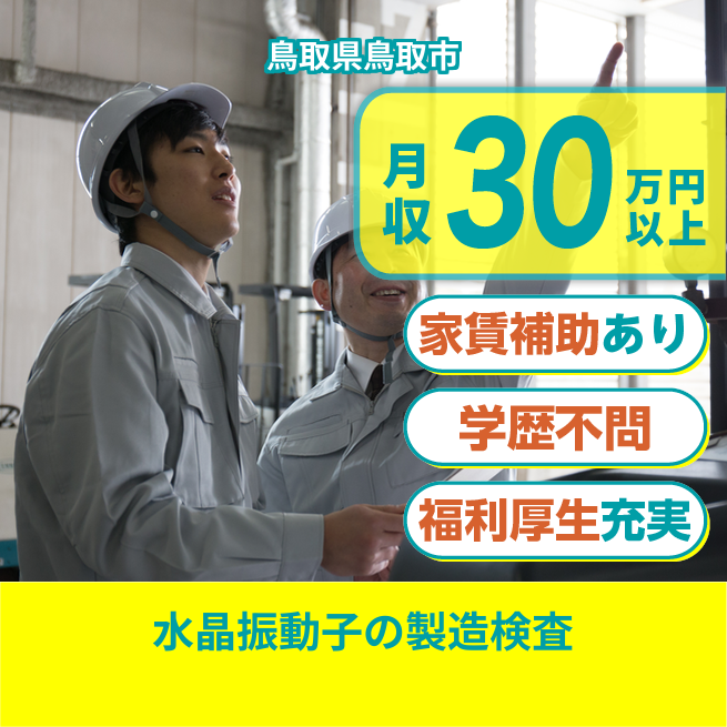 給与詳細 月収例 302,487円 日給例 11,250円 勤務地 鳥取県鳥取市 仕事内容 水晶振動子製造及び検査。