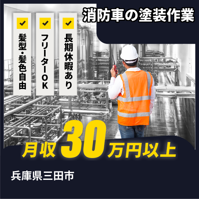 給与詳細 月収例 306,508円 日給例 11,250円 勤務地 兵庫県三田市 仕事内容 消防の特殊車両(はしご車など)の塗装作業。