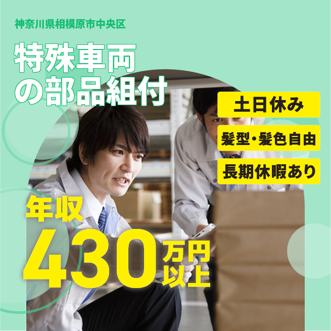 給与詳細 月収例 324,527円 日給例 12,500円 勤務地 神奈川県相模原市中央区 仕事内容 特殊車両の一部に部品を組付け検査、後工程へ流す。