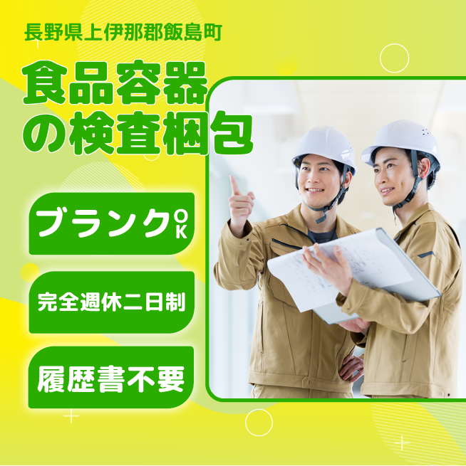 給与詳細 月収例 180,000円 時給例 1,300円 勤務地 長野県上伊那郡飯島町 仕事内容 クリーンリーム内で食品容器の目視検査・箱詰め