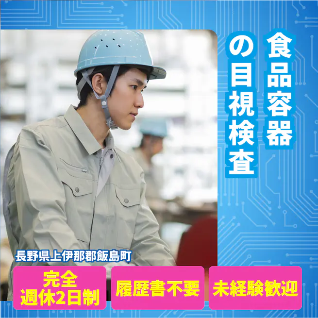 給与詳細 月収例 180,000円 時給例 1,300円 勤務地 長野県上伊那郡飯島町 仕事内容 【業務内容】食品容器の目視検査と箱詰め作業