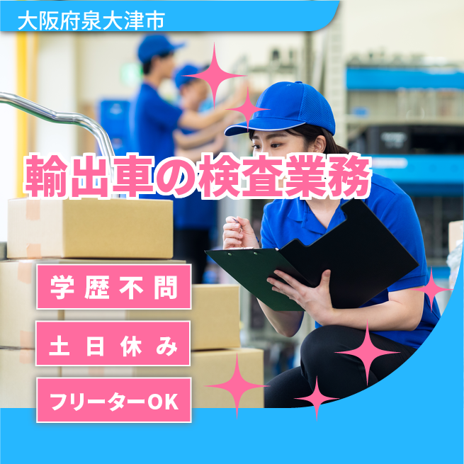 就業場所:全国/就業範囲:派遣先業務全般(詳細は就業条件明示書で明示する) 輸出車の検疫検査業務。車内やボンネットの中に虫がついていないかどうか目視で確認、噴霧器を用いて殺虫剤を塗布・車のキズやへこみなどの損傷個所を点検(写真を撮る)、検査内容をシステムに入力(スマホもしくはタブレットを使用)、冬場のみコンテナに車を入れて90℃まで温めて虫を駆除。頻繁ではないが業務で車を動かす事や、業務車両を運転する可能性があります。