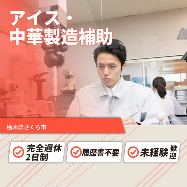 給与詳細 月収例 169,000円 時給例 1,160円 勤務地 栃木県さくら市 仕事内容 【業務内容】アイスクリームと中華まんじゅうの製造業務