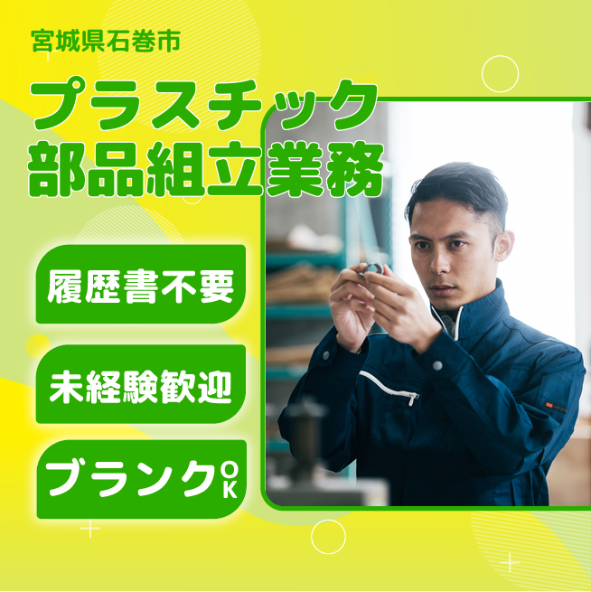 給与詳細 月収例 200,000円 日給例 10,000円 勤務地 宮城県石巻市 仕事内容 【業務内容】自動車用プラスチック部品の組立オペレーター