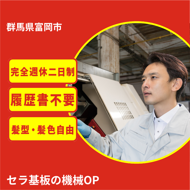 給与詳細 月収例 243,750円 日給例 10,000円 勤務地 群馬県富岡市 仕事内容 半導体セラミック基盤の製造をしている企業でのセラミック基盤のマシンオペレーター業務