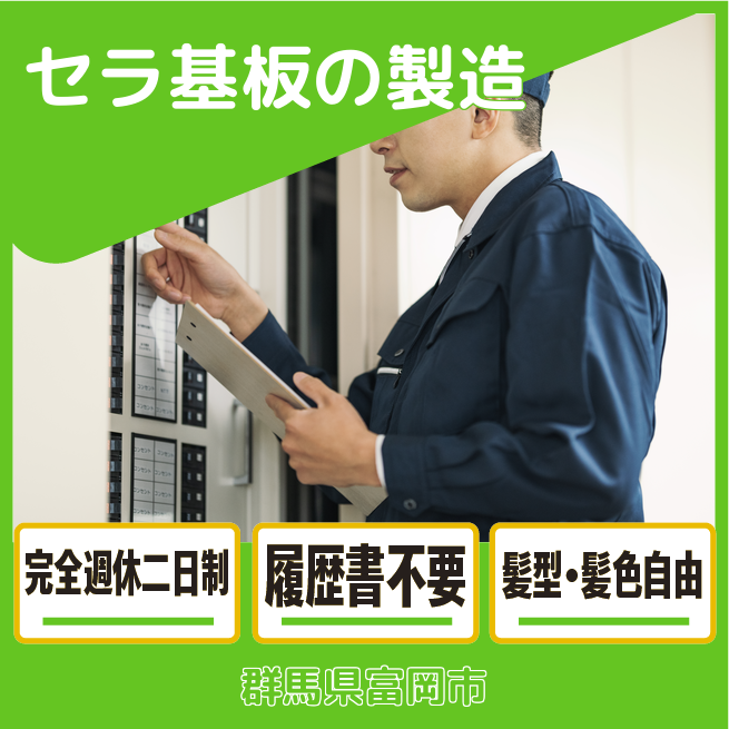 給与詳細 月収例 243,750円 日給例 10,000円 勤務地 群馬県富岡市 仕事内容 半導体セラミック基盤の製造をしている企業でのセラミック基盤のマシンオペレーター業務