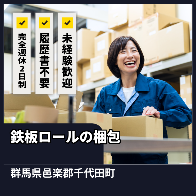 給与詳細 月収例 257,400円 日給例 10,560円 勤務地 群馬県邑楽郡千代田町 仕事内容 ロール状の鉄製品の梱包、機械操作、機種切り替え