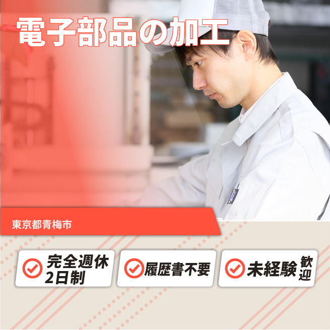 給与詳細 月収例 259,350円 日給例 10,640円 勤務地 東京都青梅市 仕事内容 【業務内容】電子部品の不純物を取り除く簡単な加工業務