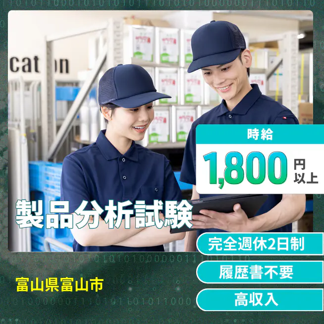 給与詳細 月収例 310,500円 時給例 1,800円 勤務地 富山県富山市 仕事内容 【業務内容】消臭剤やうがい薬の製品分析と試験を行う