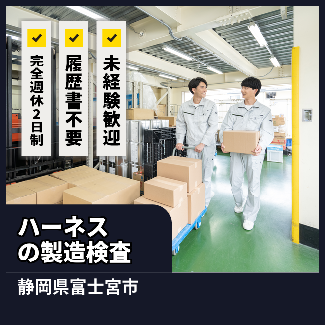 給与詳細 月収例 239,850円 時給例 1,230円 勤務地 静岡県富士宮市 仕事内容 ワイヤーハーネスの製造や検査のお仕事です☆彡