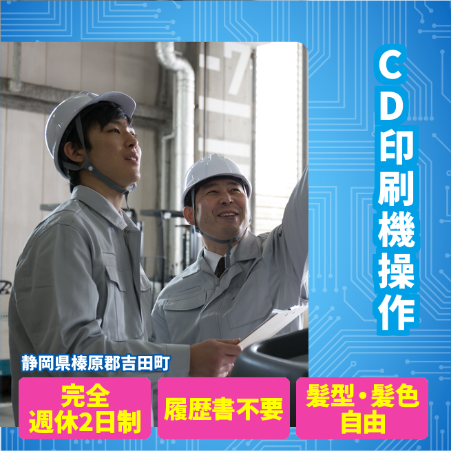 給与詳細 月収例 180,000円 時給例 1,200円 勤務地 静岡県榛原郡吉田町 仕事内容 【業務内容】CDやDVDの表面にタイトルを印刷するための機械操作を担当します。