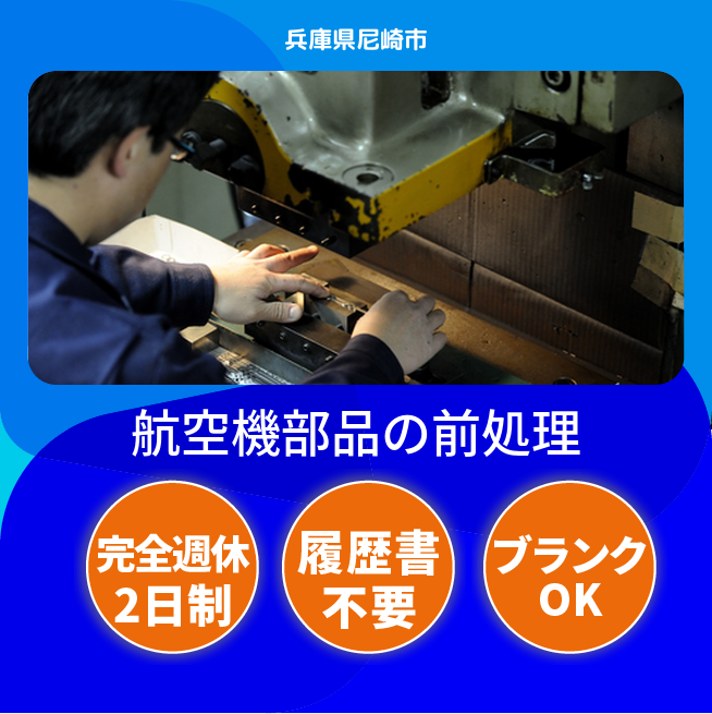 給与詳細 月収例 273,000円 日給例 11,200円 勤務地 兵庫県尼崎市 仕事内容 ①脱脂(洗浄材による油除去)作業全般