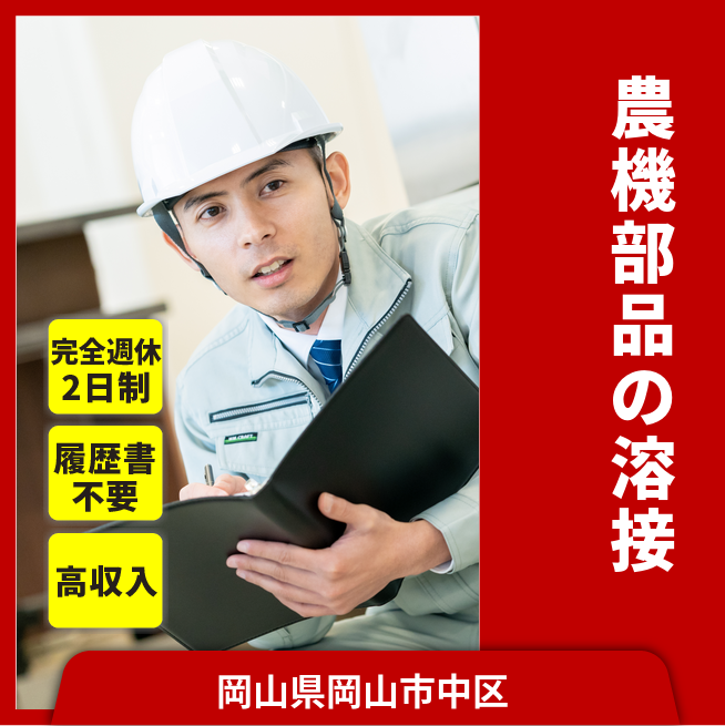 給与詳細 月収例 265,000円 日給例 13,250円 勤務地 岡山県岡山市中区 仕事内容 農機具の溶接業務をしていただきます!未経験でもOK!日勤専属で繁忙期には残業でガッツリ稼げます