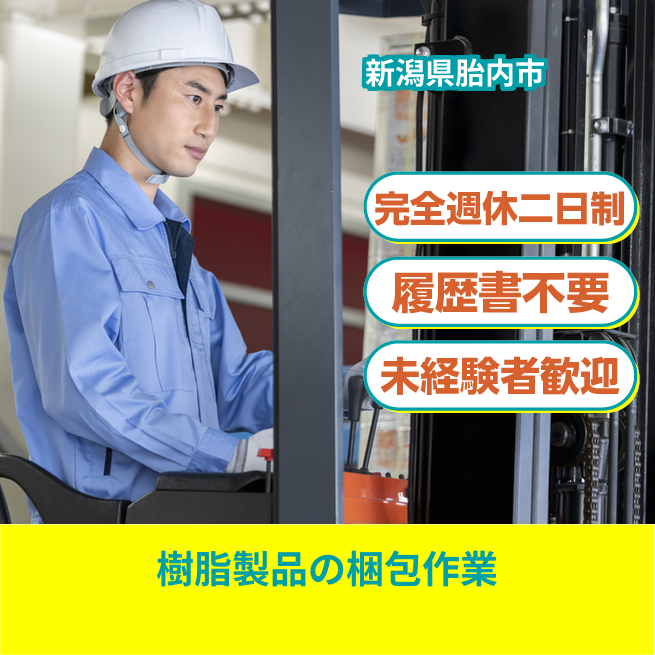 給与詳細 月収例 213,360円 日給例 10,668円 勤務地 新潟県胎内市 仕事内容 【業務内容】樹脂製品の梱包とフォークリフトによる積み替え作業