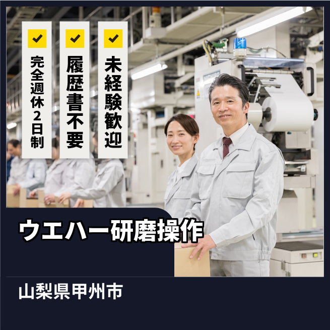 給与詳細 月収例 224,000円 日給例 11,200円 勤務地 山梨県甲州市 仕事内容 【業務内容】ウエハーを加工する機械の操作
