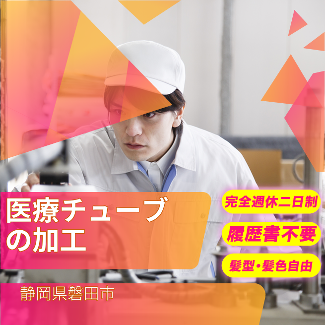 給与詳細 月収例 208,000円 日給例 10,400円 勤務地 静岡県磐田市 仕事内容 【業務内容詳細】医療用プラスチックチューブの加工と検査を行う作業。(1)直径5ミリ(アイフォンに付属でついている充電コードぐらいの細さ)程の細いチューブの周りにワイヤーチューブを編み込んでいく機械の補助。(2)ワイヤーの簡単な加工。加工されたワイヤーを決まった長さに切る。 2m以上の長さのコードを1m程にする作業。(3)チューブのなかにワイヤーをさす仕事。?機械によりコードに熱を加えることで拡張をする。その中にワイヤーを入れる。感覚的な仕事がおおい。(4)コードの検査。拡大鏡を使ってコードに異物がないかをモニターを見ながら行う。クリーンルーム。【取扱製品情報】医療用のプラスチックチューブ、カテーテル。