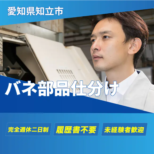 給与詳細 月収例 200,000円 日給例 10,000円 勤務地 愛知県知立市 仕事内容 【業務内容】自動車バネ部品の仕分け・梱包・出荷作業