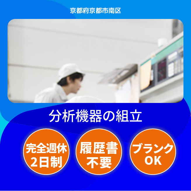 給与詳細 月収例 243,750円 日給例 10,000円 勤務地 京都府京都市南区 仕事内容 医薬品製造や食品品質管理に用いる分析・計測機器の分析計組立(はんだ付け・圧着作業)業務