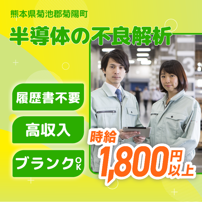 給与詳細 年収例 4,200,000円 月収例 350,000円 勤務地 熊本県菊池郡菊陽町 仕事内容 半導体製品、主にCISにおける不良解析および形状解析業務