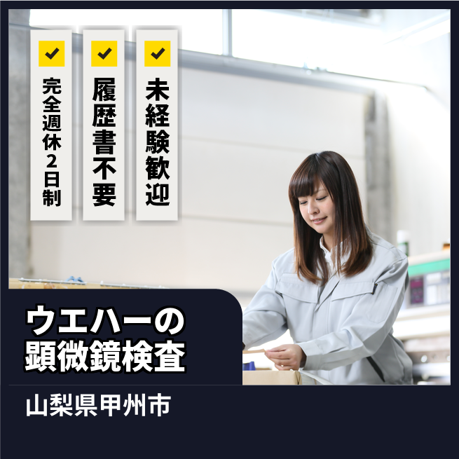 就業場所:全国(派遣先)/就業範囲:派遣先業務全般(詳細は就業条件明示書で明示する) 顕微鏡を使用してのシリコンウェハーの検査・梱包