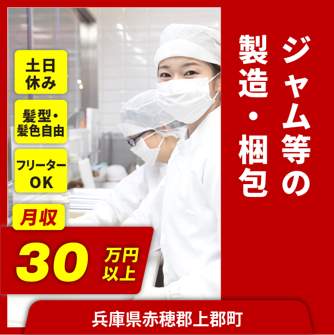 給与詳細 月収例 303,200円 日給例 11,585円 勤務地 兵庫県朝来市 仕事内容 【ピーナッツクリームやジャムの製造作業】