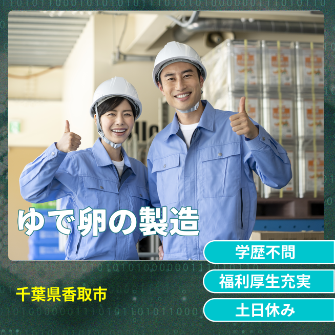 給与詳細 月収例 211,740円 時給例 1,173円 勤務地 千葉県香取市 仕事内容 茹卵製造