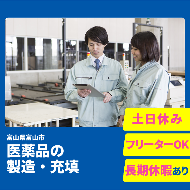 給与詳細 月収例 162,000円 時給例 1,012円 勤務地 富山県富山市 仕事内容 医薬品製造にかかわる業務