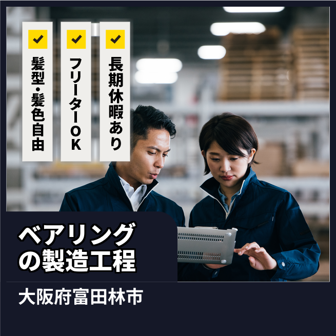 給与詳細 月収例 314,750円 日給例 10,324円 勤務地 大阪府富田林市 仕事内容 【ベアリング製造に伴う、研磨、加工作業・組立作業・検査作業・梱包作業】