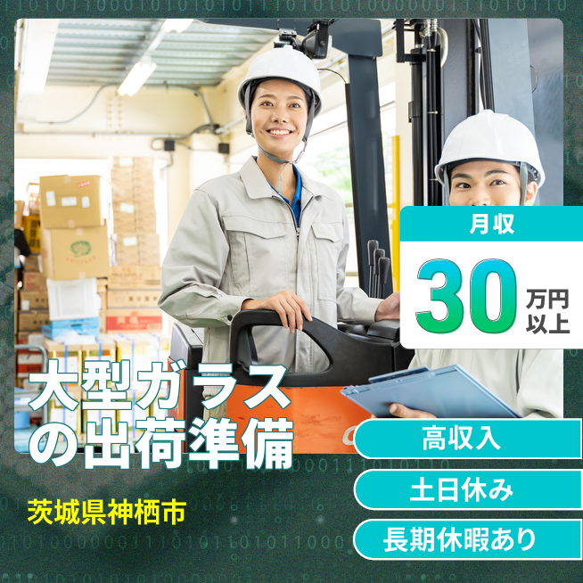 給与詳細 月収例 307,370円 日給例 11,200円 勤務地 茨城県神栖市 仕事内容 ガラス製品の運搬、荷積み、準備作業