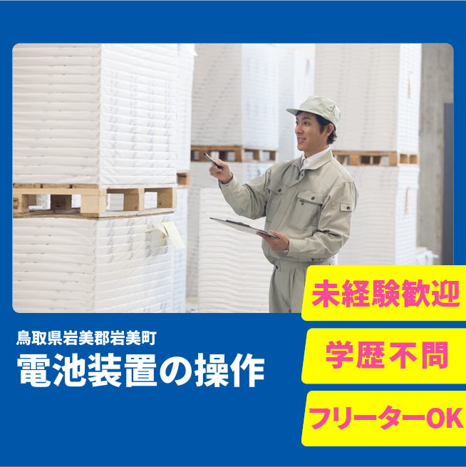 給与詳細 月収例 257,964円 時給例 1,187円 勤務地 鳥取県岩美郡岩美町 仕事内容 リチウム電池を製造する装置を扱っていただく機械オペレーター業務です。
