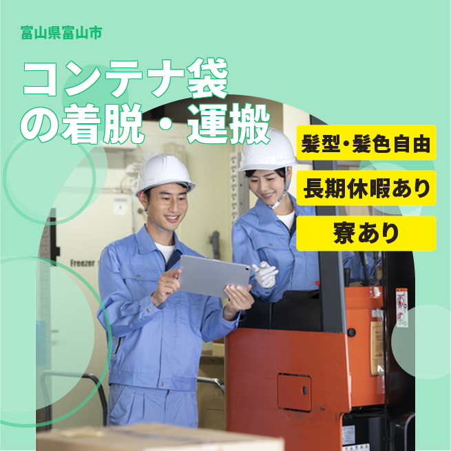 給与詳細 月収例 275,095円 日給例 11,100円 勤務地 富山県富山市 仕事内容 空のコンテナバッグを装置に取り付け、一杯になったらフォークリフトを使って取り出し、保管所に移動させます