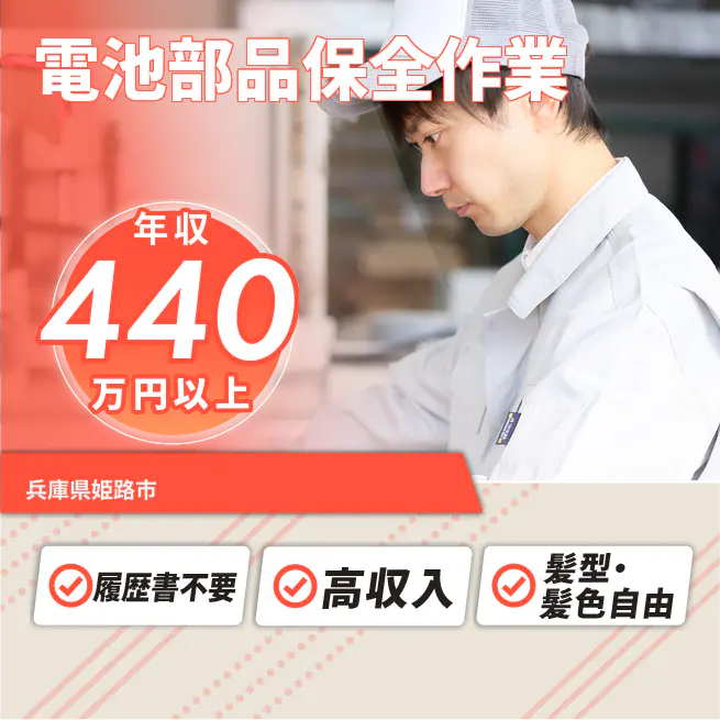 給与詳細 年収例 4,800,000円 月収例 400,000円 勤務地 兵庫県姫路市 仕事内容 【業務内容】電子部品の製造過程での保全業務