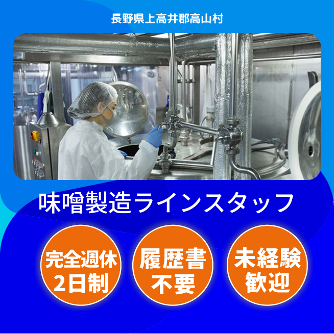 給与詳細 月収例 132,000円 時給例 1,100円 勤務地 長野県上高井郡高山村 仕事内容 お味噌や関連製品の製造のお仕事です!未経験歓迎!時短のお仕事!