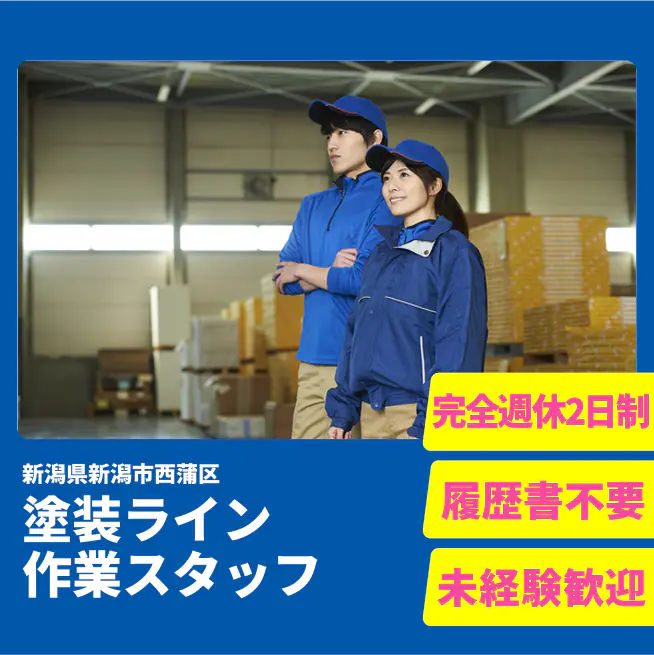 給与詳細 月収例 223,275円 時給例 1,145円 勤務地 新潟県新潟市西蒲区 仕事内容 【業務内容】塗装ラインでの製品の取り扱いと軽作業