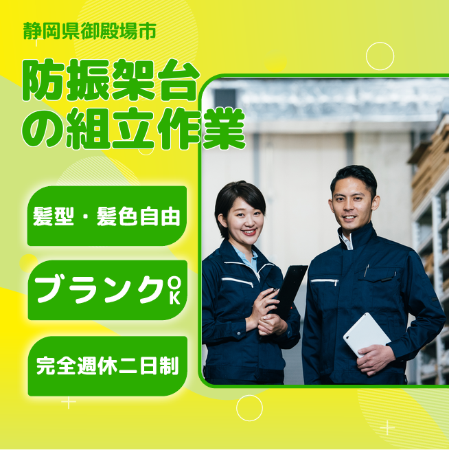給与詳細 月収例 273,000円 日給例 11,200円 勤務地 静岡県御殿場市 仕事内容 【業務内容】エアコン室外機用の防振架台の組立作業