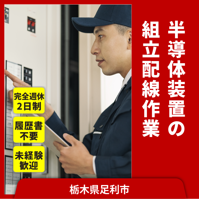 給与詳細 月収例 220,000円 日給例 11,000円 勤務地 栃木県足利市 仕事内容 半導体製造装置(モールディング)の組立及び配線作業
