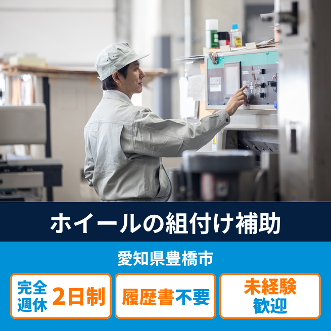給与詳細 月収例 230,000円 日給例 11,500円 勤務地 愛知県豊橋市 仕事内容 タイヤのホイールを運搬しラインにセットする(最大15キロ程度)作業やバルブの組付け、フィルム張り