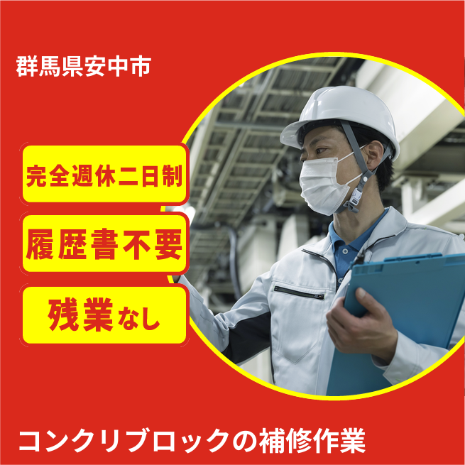 給与詳細 月収例 253,500円 日給例 10,400円 勤務地 群馬県安中市 仕事内容 コンクリートブロック 補修パテ塗作業 屋外作業