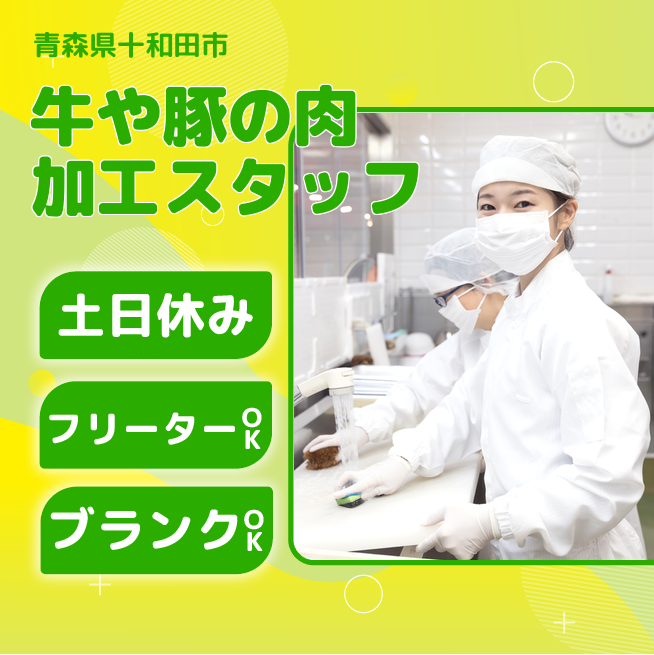 給与詳細 月収例 198,550円 時給例 1,100円 勤務地 青森県十和田市 仕事内容 【食肉加工】