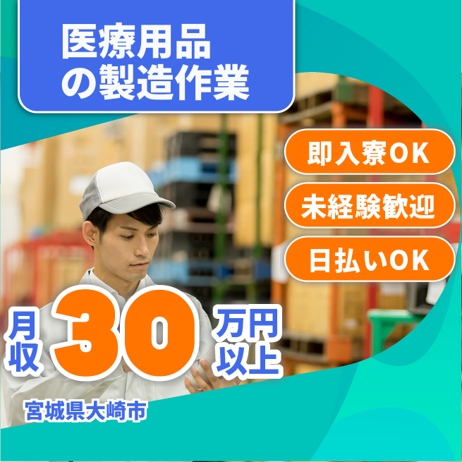 給与詳細 月収例 262,438円 日給例 10,400円 勤務地 宮城県大崎市 仕事内容 【医療用品の製造作業】