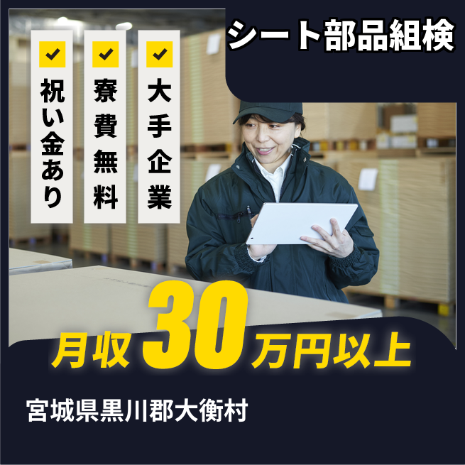 給与詳細 月収例 301,640円 日給例 11,600円 勤務地 宮城県黒川郡大衡村 仕事内容 【概要】