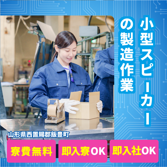 給与詳細 月収例 204,887円 時給例 1,150円 勤務地 山形県西置賜郡飯豊町 仕事内容 【小型スピーカーの製造作業】